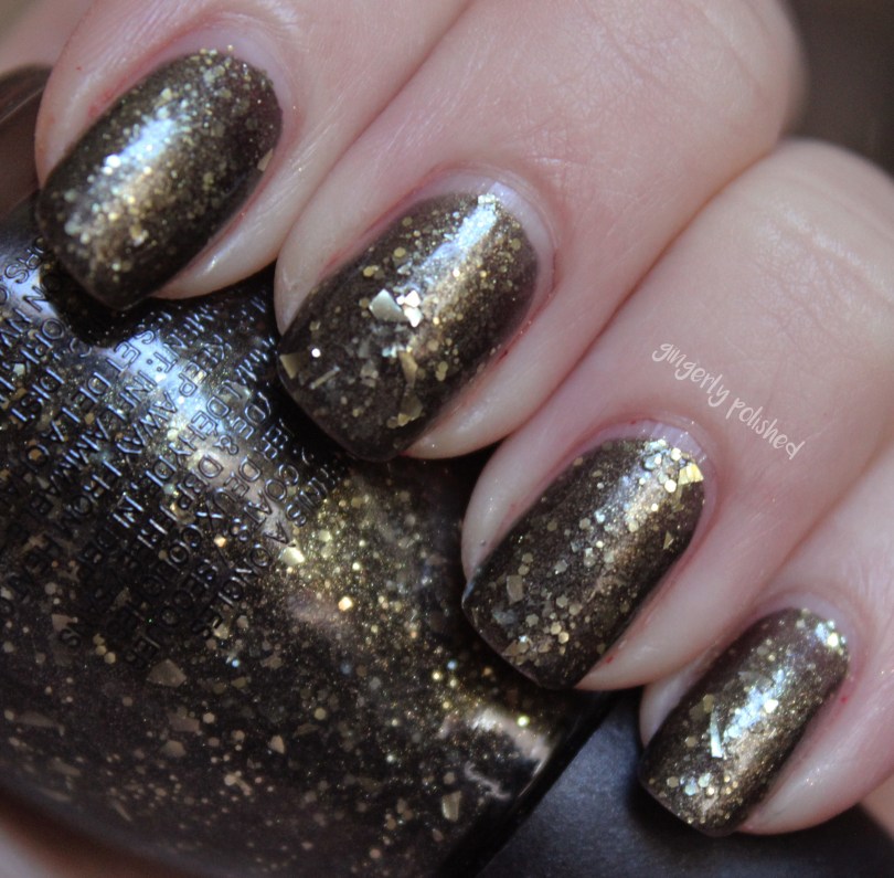 2094 – ‘Strike a Pose’ is a black jelly base with gold microshimmers, gold glitters and gold flakes. Like all the others it had a sheer 1st coat, and then was opaque in 2-3 coats depending on how thickly you apply your coats. Another one where the flakes really stand out against the base. This was the one that actually held up my swatching of this collection. I opened the bottle to find there was no brush on the end of the cap – certainly makes using it harder. But luckily the employees at Walgreens are all so lovely and let me exchange it for a new one so I had the full collection still.