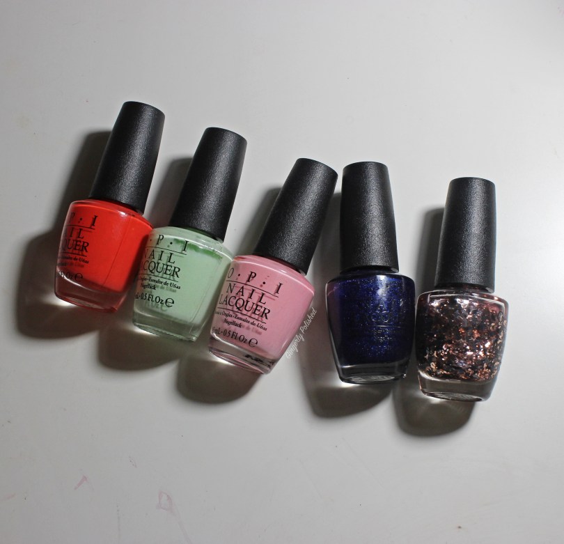 Up first are 5 polishes from OPI. These were some of my first OPI polishes, and they’re special to me because my mom got them for me. Each year at Christmas, I would ask for polishes from the newest OPI collection (apparently I was paying a little bit of attention even back then). Before I had found the discount websites I use now, OPI polishes were far too expensive for me to buy on my own.