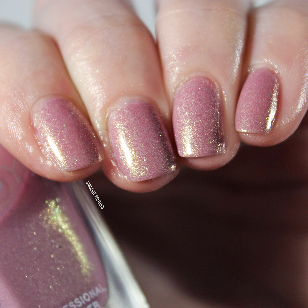 Wanda’s cooler-toned cousin of the collection is ‘Patrice’. This is a soft blush-toned shade with the same golden shimmer. It has some nail line peeking through after 1 coat, but it’s smooth, and with the color it would make a lovely “1 coat sheer nail look”. It does build up to fully opaque with a 2nd coat.