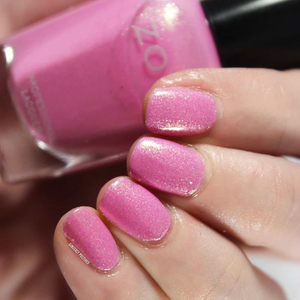 ‘Wanda’ is a light bubblegum pink base with tons of golden shimmer to it. It had a smooth 1st coat, though it did have some nail line peeking through. It does build up well in 2 coats, and depending on your preferences could be good there. I ended up adding a 3rd since I still had a touch of nail line peeking through, and it did continue to build up the base color with that 3rd coat.