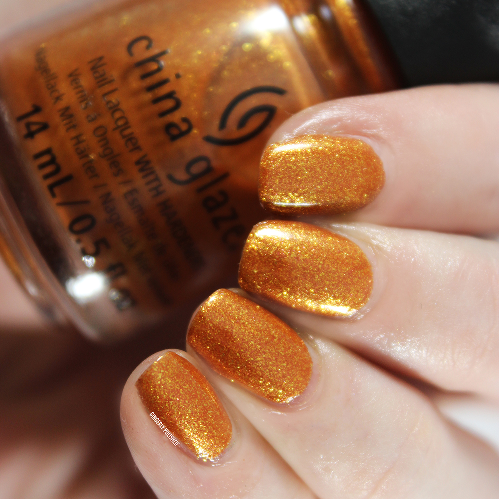 This is a lovely marigold orange base with tons of golden shimmer to it. This had a smooth but sheer 1st coat, with my nail line showing through. It builds up well in 2 coats, and is pretty well opaque so depending on your preferences you can stop there or add a 3rd coat like I did. It was an easy formula overall and went on nicely!