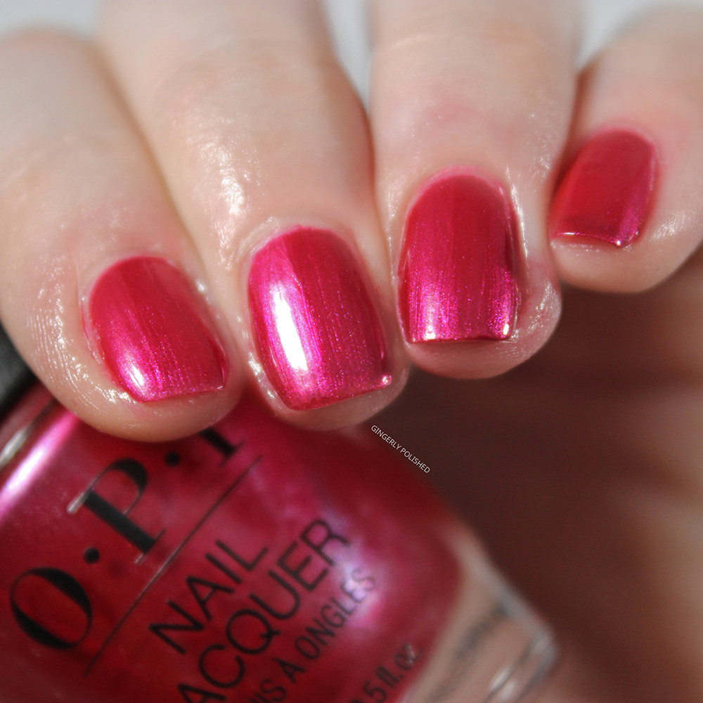 Our only straight up cream of the collection, ‘Red-y for the Holidays’ is a lovely cool-toned cherry red. And if there’s a formula that OPI absolutely knows how to nail, it’s a red cream. This had an amazing formula and is opaque in just 1 coat. It’s incredibly smooth and just glides onto the nail. So beautiful, and great to add to a collection if you’re missing a more cool-toned holiday red!