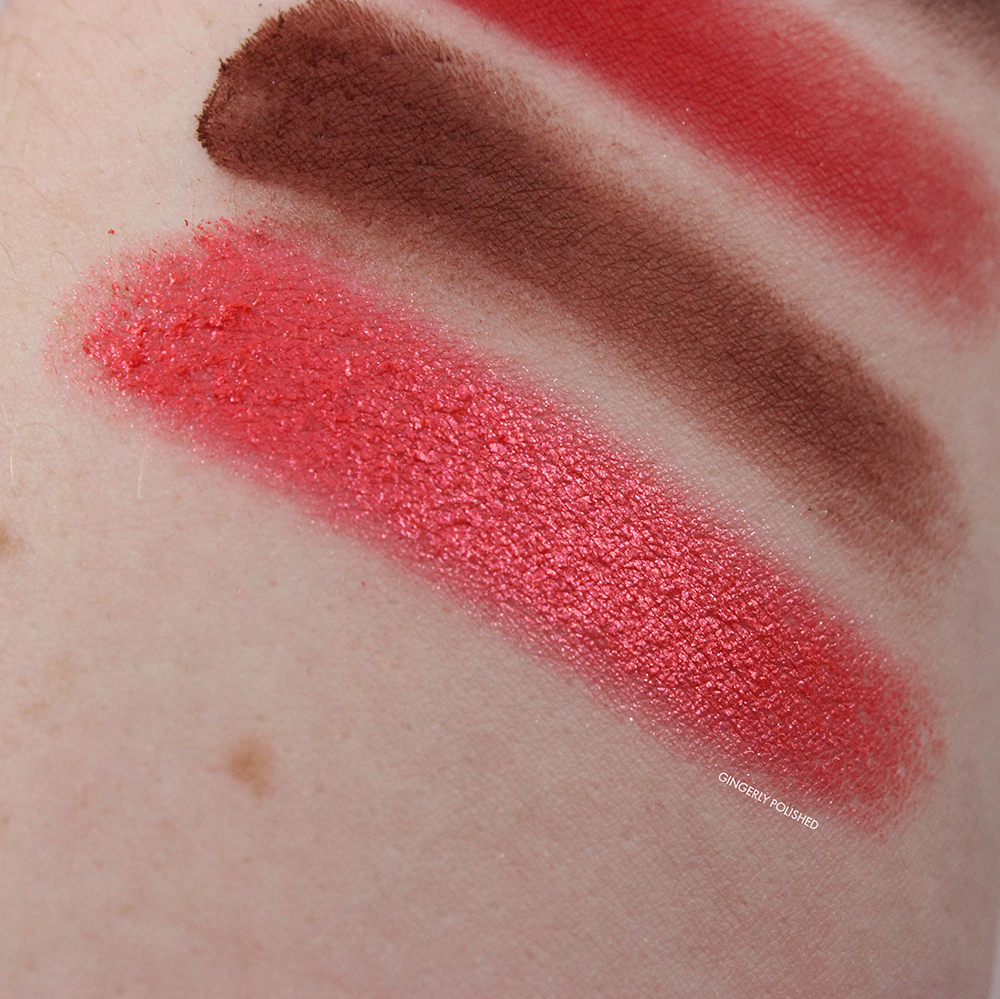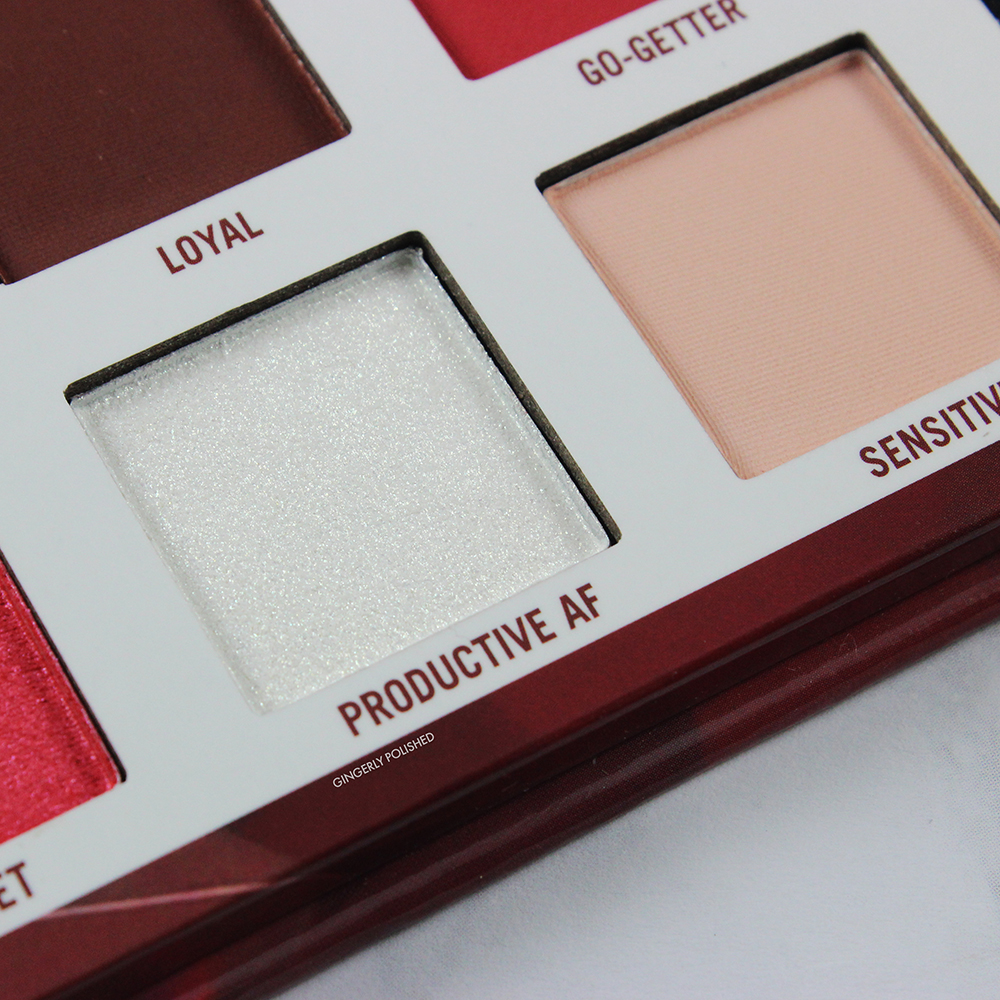 The 2 shimmers definitely felt a touch thicker in pan and on application than others I have, which you can see a touch in the closeup of ‘Garnet’, the red shimmer. But they still pick up easily with a brush and I can pack them onto the lid. I do prefer pressing and swiping more than just tapping them onto the lid. And of course, using a finger to press them on, or spraying them with water will give even more of an impact on the lid. ‘Productive AF’, the white shimmer, definitely feels a touch more chunky and crumbly, but I was able to smooth it out on the lid with a brush and swiping motion. Again, overall nothing too hard to work with, and you can see they look beautiful on the lids, and are still stunning shimmers.