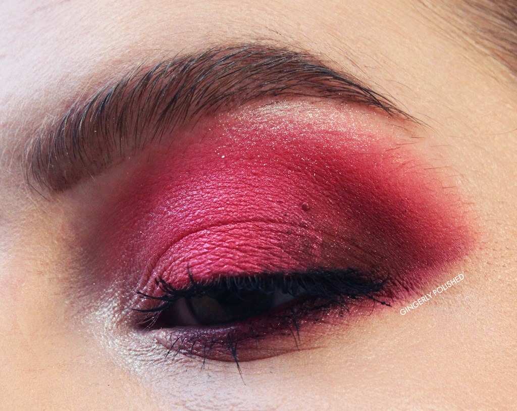 And now for the eye looks! For the first one, of course I had to do a full red eye look! This is ‘Go-Getter’ all throughout the crease, blended out with ‘Sensitive’. I deepened the outer corner with ‘Loyal’, and then used ‘Garnet’ all over the lid. And a touch of ‘Productive AF’ on the browbone.
