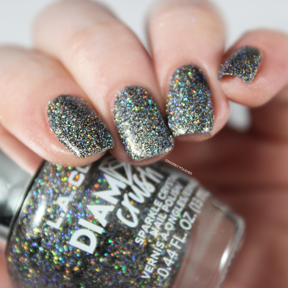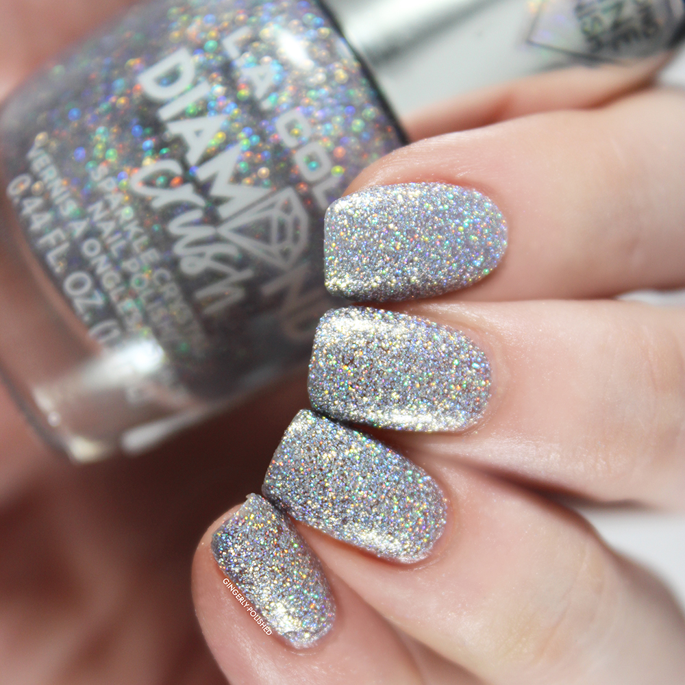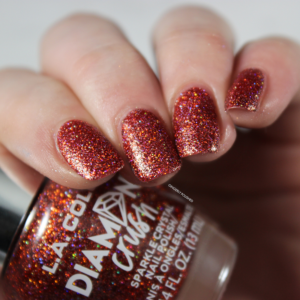 This is the ‘Diamond Crush’ collection. It features 8 shades of polish with a more jelly like colored base and dense holographic glitter, giving it an overall scattered holographic finish. I snagged these off of the LA Colors website for $3, and I know they’re also available at Five Below stores.