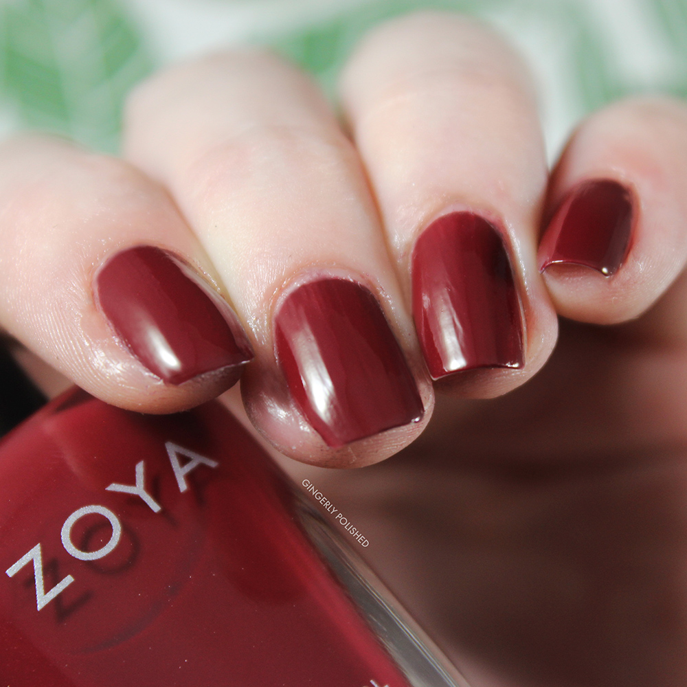 Up first we have ‘Mila’. This is a deep, warm toned berry red cream shade. I was using the normal skinnier Zoya brush, so it was definitely more uneven on the 1st coat than it would be with the wider brush. (You might see a little struggle in the swatch video as I adjust to the brush, I’m used to wide now, okay). But a 2nd coat easily covered and made it opaque and smoothed out the color.