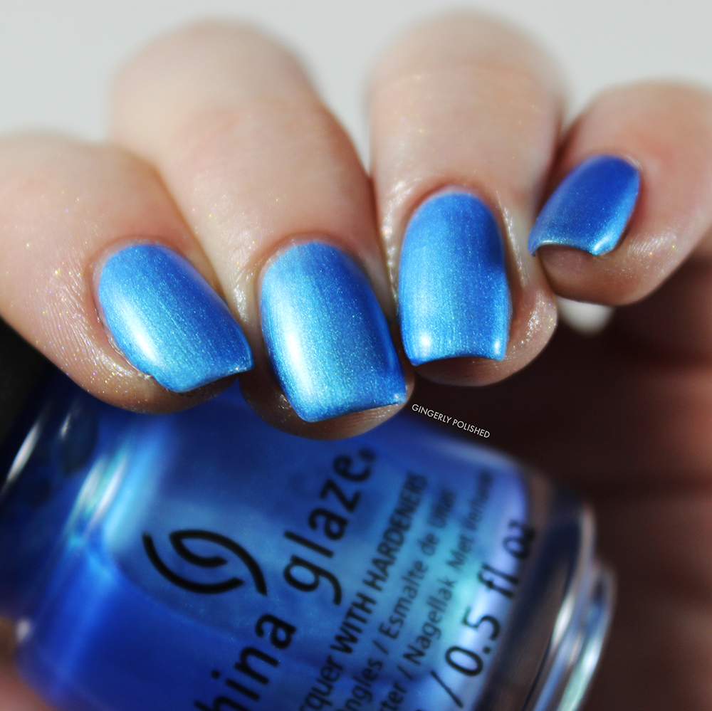 ‘Stay Frosted’ is a well, frosty blue shimmer with an almost green shift to it. It’s described as a matte finish – which you can really see with the 1st coat (you can also see how much that green shift pops as well) but it didn’t seem that matte on the 2nd coat or in the finished photos! I didn’t even think it was a matte at all until I read the description from China Glaze. So who knows, maybe it’ll be matte, maybe you’ll need to mattify it! Either way it was an easy 2 coat formula here.