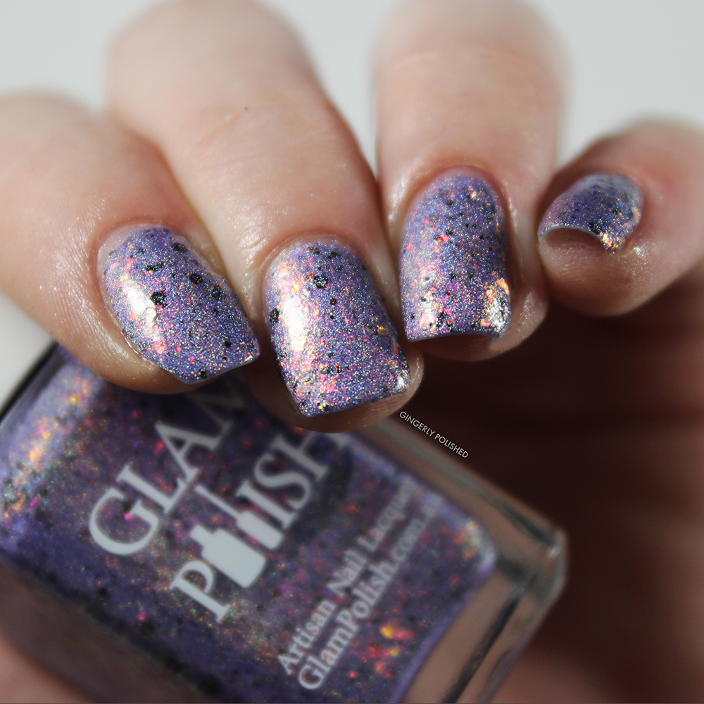 Next up we have a longer and longer name, surprised it fit on the little sticker really, I’m impressed. This is ‘Every Cinderella Needs a Fairy Godmother’. This is a lilac purple holographic base with lots of pink iridescent flakes, and larger black glitter pieces. Again, an easy two coats and it was fully opaque on my nails. Another super fun look!