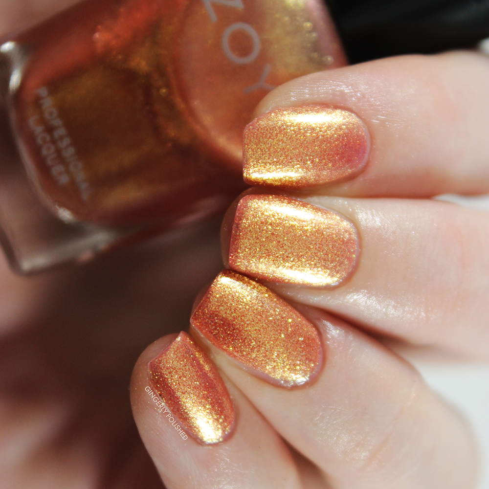 Next up, we have ‘Esme’. This is a peachy-coral-orange base with tons of golden glitter to it. Again, a more sheer formula so I built this up in 3 coats. But this one is fully opaque after those 3 coats, and I just love the glittery look of these.