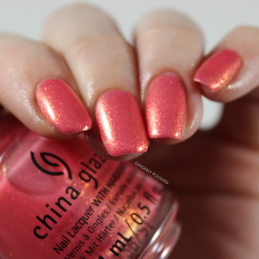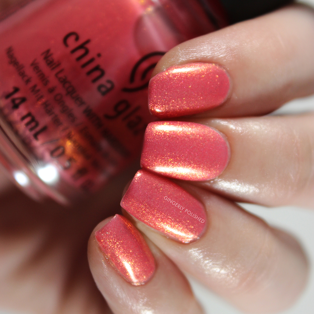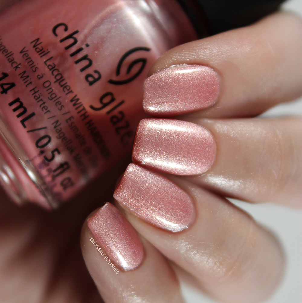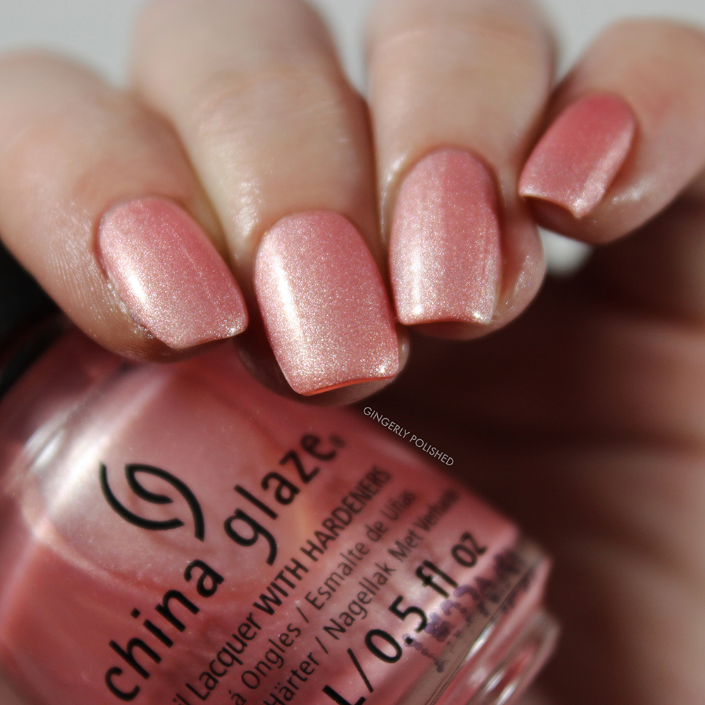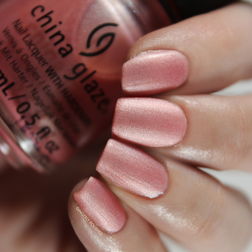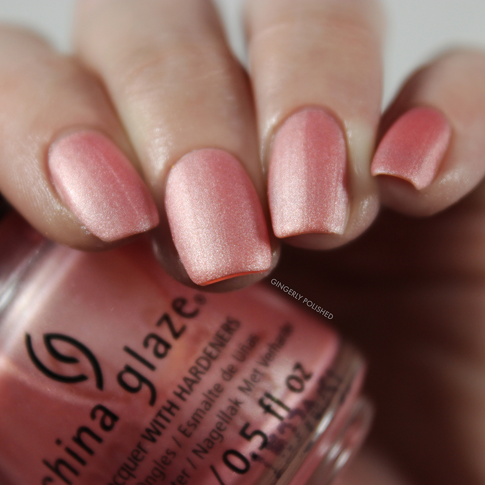 Diving right in, we have ‘Pretty as a Petal’, a lighter almost coral-toned pink shade with delicate silver shimmer all throughout that dries with a matte finish. Since it’s a matte finish it will dry more quickly than a normal cream finish, but unlike other matte formulas CG has in the past, you have more than enough time to work with it and smooth it out. This was an easy 2 coat formula for me, and as you can see I didn’t have issues with brushstrokes.