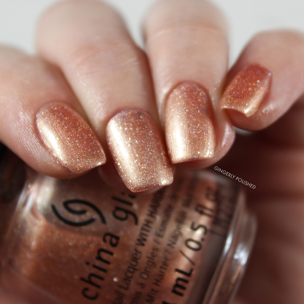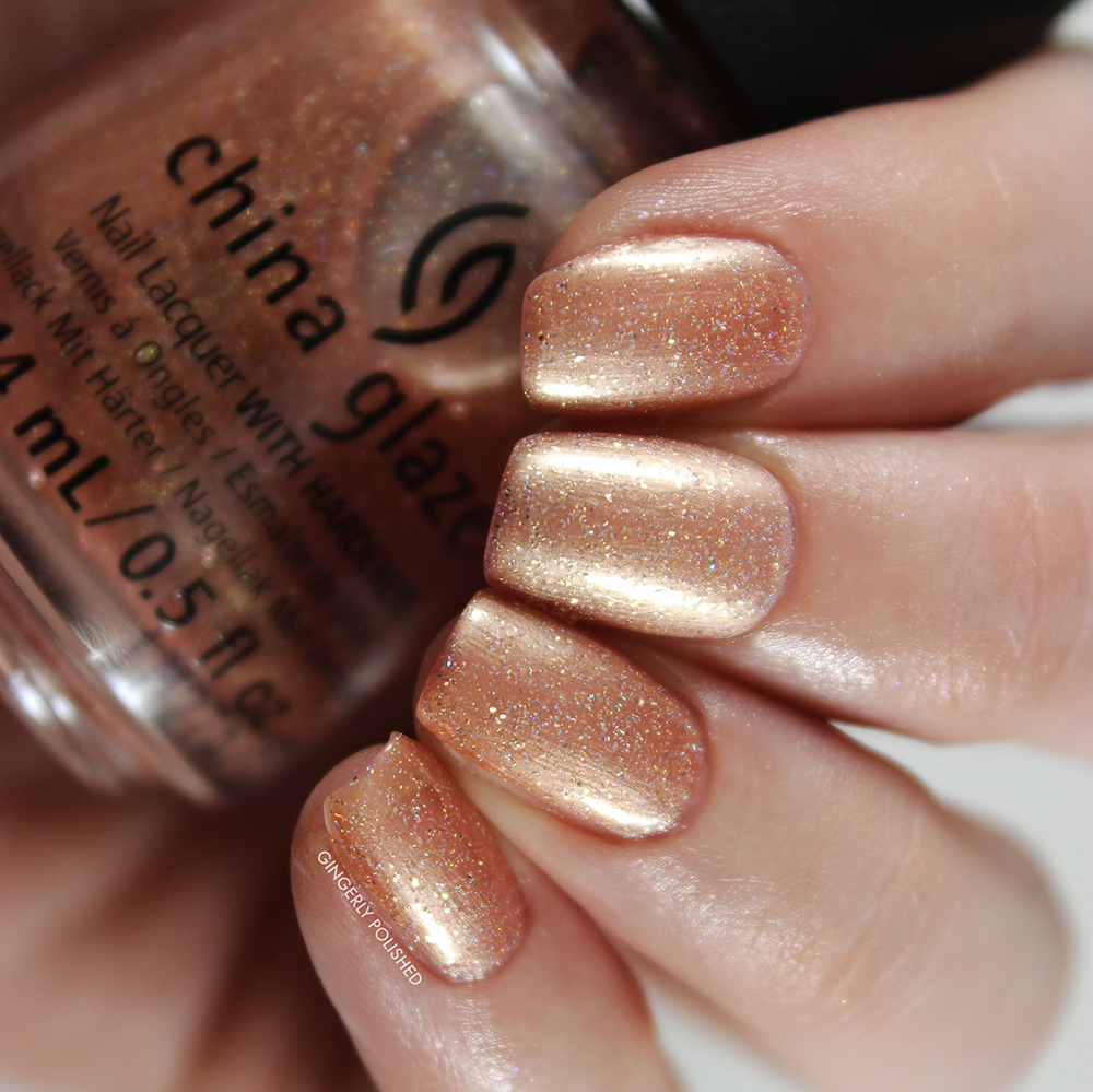 And last up, we’re in the duo of more beige-neutral shades. First up is ‘Instant Sparks’, and it has to be another favorite for that finish. It’s a metallic, light coppery beige base with larger holographic silver glitters all throughout.