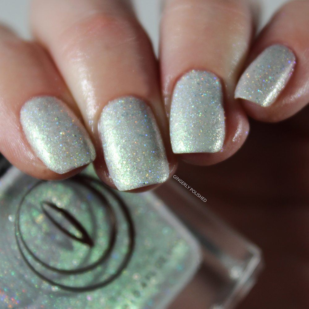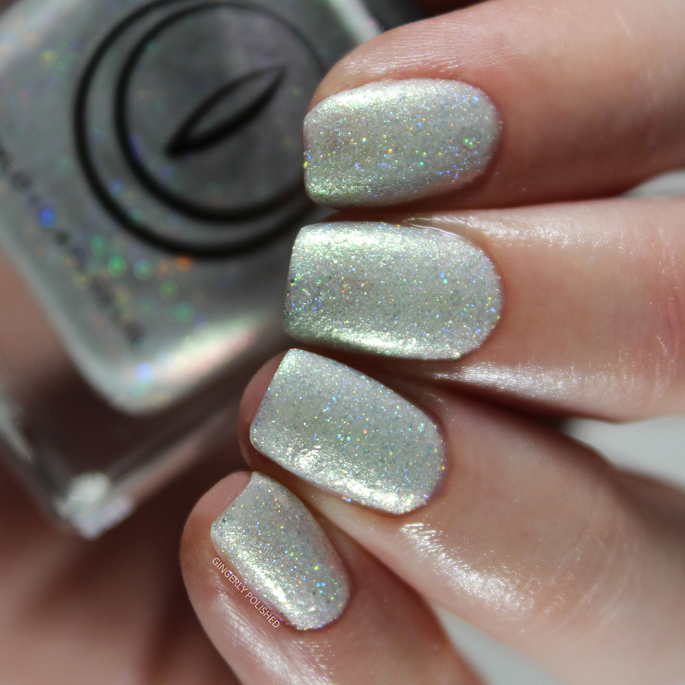 As mentioned, this has an off-white, gray toned base with an absolutely stunning bright green shift to it. For formula, just like the others, I built this up in 3 thinner coats. If you’re going thicker, you can get away with just 2, but with this dense shimmer formula I preferred to go thinner as it can easily feel thicker and goopy on the nails. Otherwise it was smooth and easy to paint on, just so sparkly.