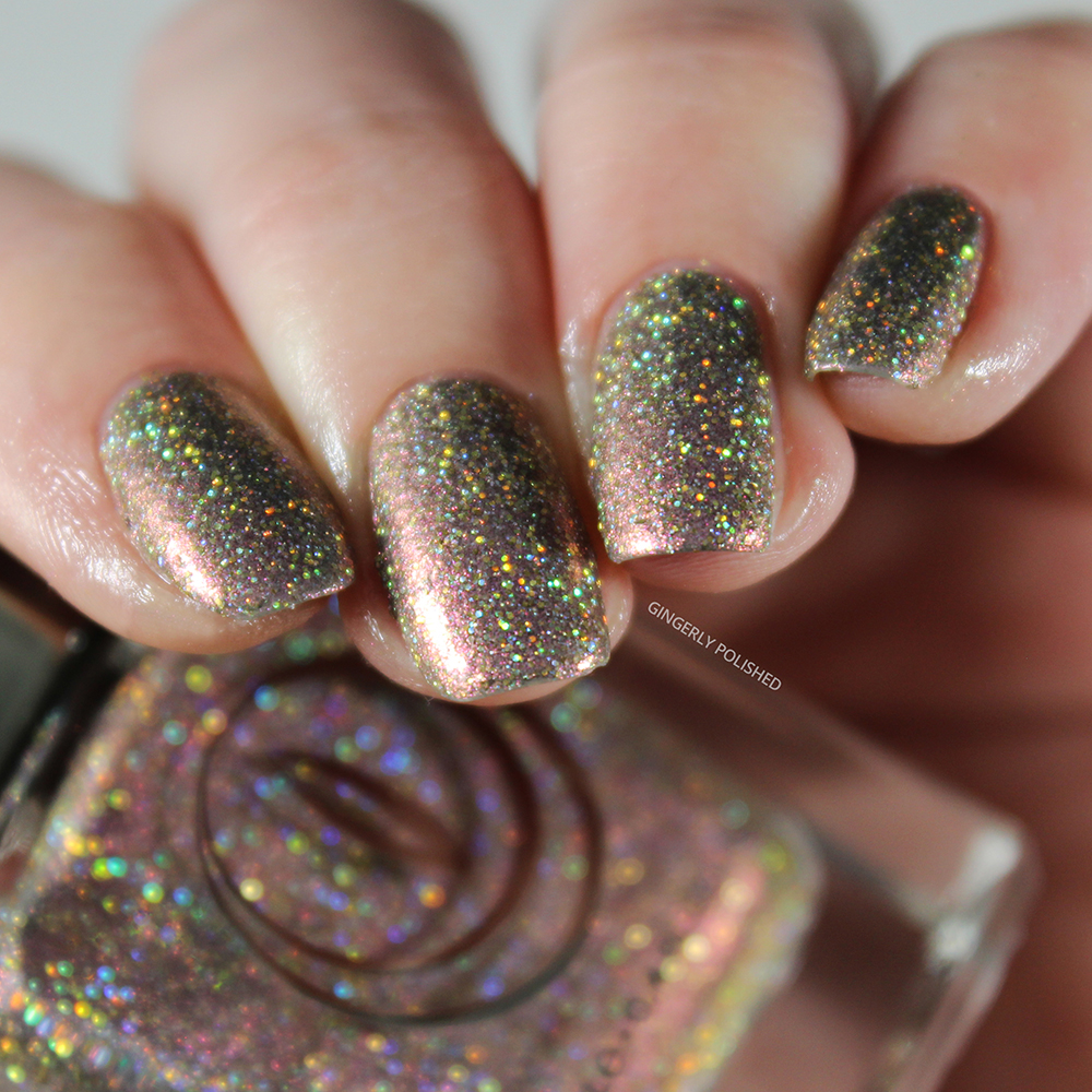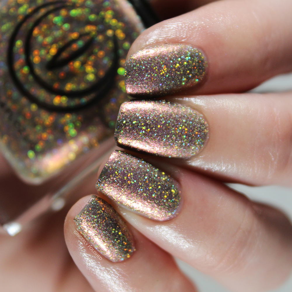 Starting right in we have ‘Heart of Stone’. This one is a more slate-brown base that shifts to a bright pink, just jam packed with that holographic glitter. This photo is in my bright lighting, but without flash at all, so you can absolutely see how much that holo sparkle just SHINES. In the sun these will be insane.