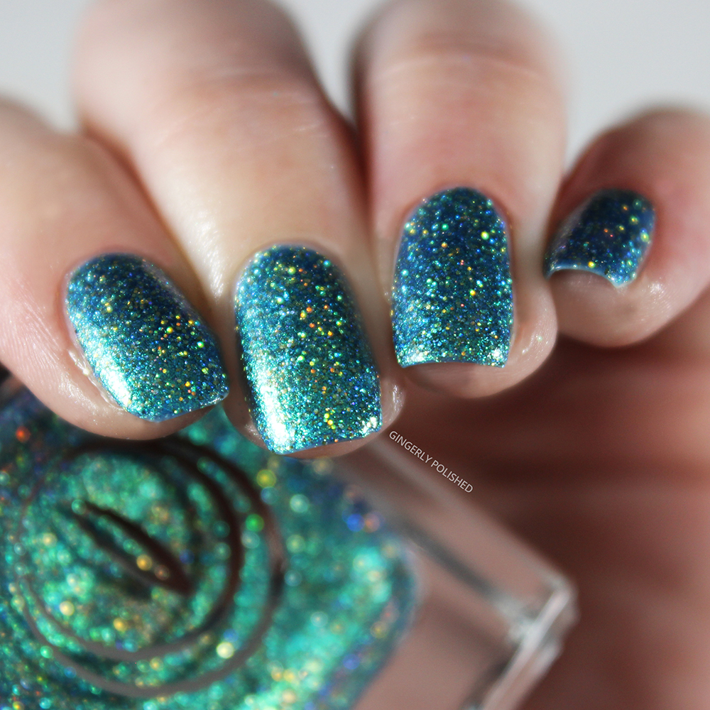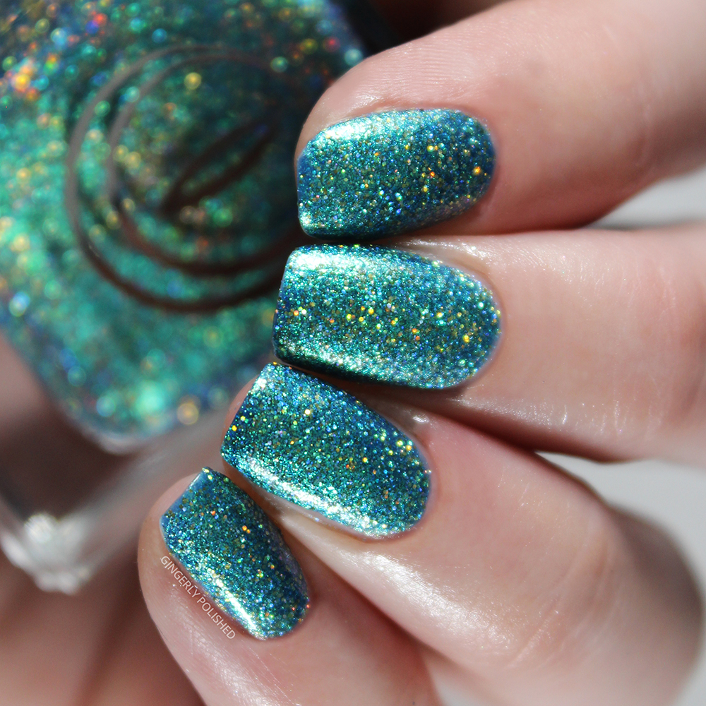 Now this next one just might be my favorite of the set for obvious reasons. This is ‘Snake Charmer’, and it’s a shimmery base that shifts between an almost bright blue to a bright turquoise shade, all packed with that same holographic shimmer.