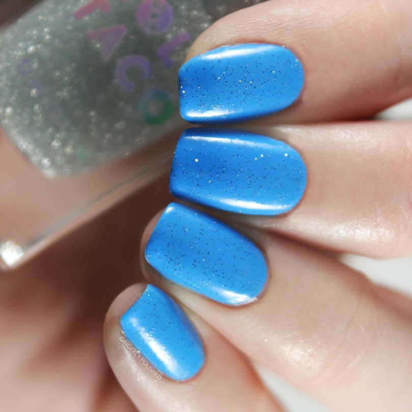 And last but certainly not least, this release comes with another topper! This is ‘Reflective Taco’ and it’s a clear base containing scattered reflective glitters all throughout. Now if you haven’t been around for the reflective glitter trend, they’re larger glitter pieces that reflect brightly flashing lights. I threw it on over a blue cream base here, and you can see it gives any shade underneath a delicate little sparkle and glitter. It was hard to capture on camera, but it’s truly so dimensional and sparkly and gorgeous.