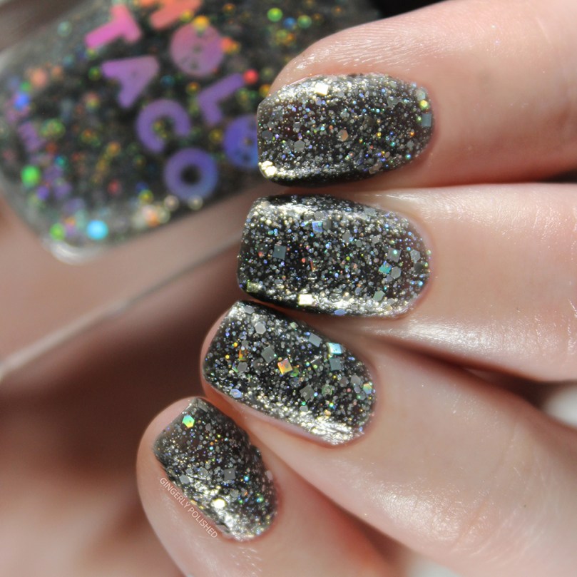 This is the ‘Gala’ collection, released in honor of Holo Taco’s 3rd Anniversary. Crazy that it’s been 3 years already, time flies truly. But along with the standard holographic sparkle we would all come to expect, this one also had a black and white theme, complete with coming in a box made to look like a clutch bag perfect for any black tie event. We have 4 full color shades and one topper shade to look at here.