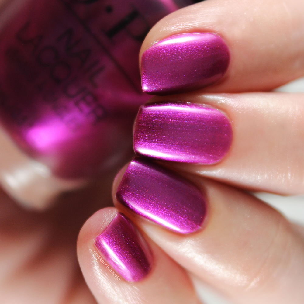 ‘Charmed, I’m Sure’ takes us back into the shimmers. It’s like the shimmery version of ‘Feelin’ Berry Good’ above, a bright fuchsia purple. Now, unfortunately this felt like the most sheer of the whole collection, and almost like a jelly – again not what I would expect from an OPI shimmer. Especially on the first coat it was more uneven than I would like.