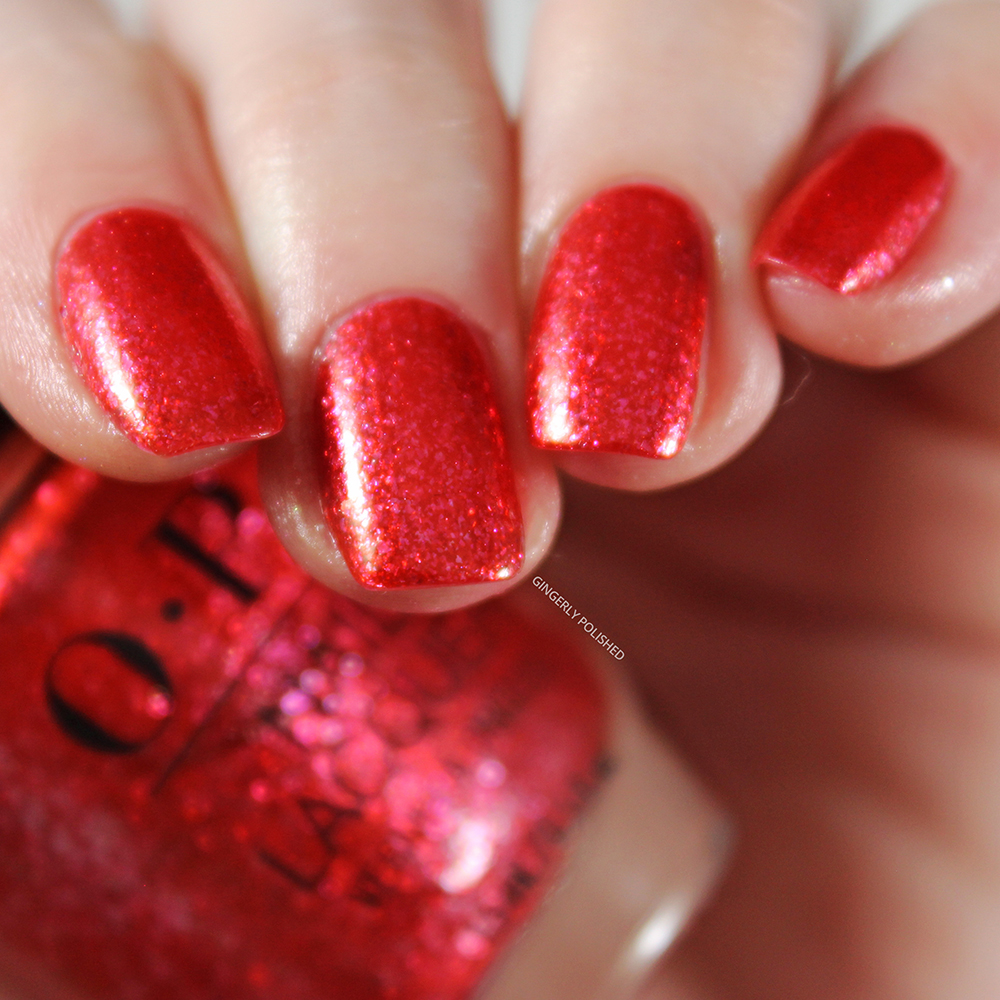 And now we’re onto the 3 glitter exclusives! Usually with their holiday collections, alongside the typical 12 shades, OPI will also release 3 glittery extras. These are sometimes toppers, or for this year we have 2 more opaque shades with 1 glitter topper. You can see them quick swatched in the video below, and then swatched out individually after!