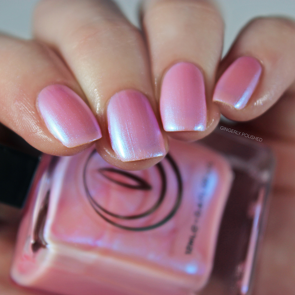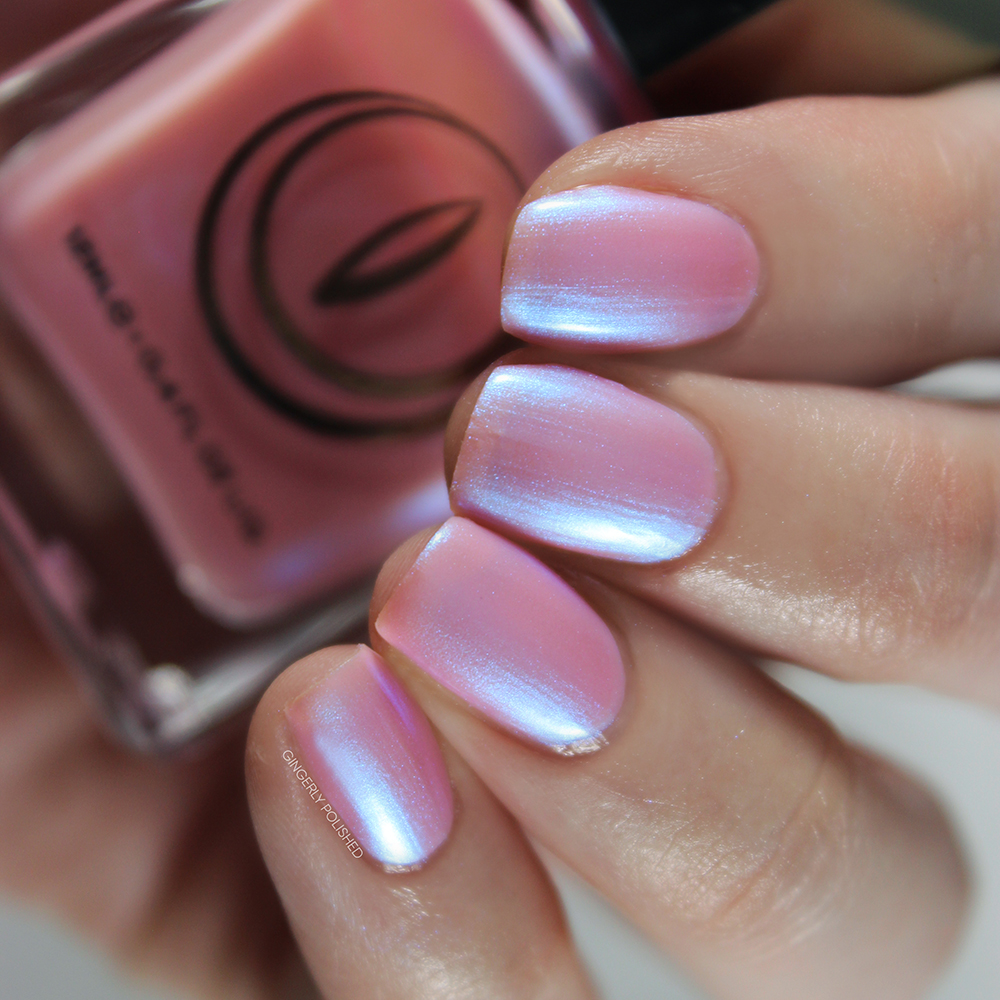 We’re starting out with this gorgeous, ethereal shade, really diving us into the “fairytale” theme. This is ‘A Midsummer’s Dream’, and it’s a soft light pink base with a gorgeous aqua blue shimmer running throughout it giving it an icy aqua flash.