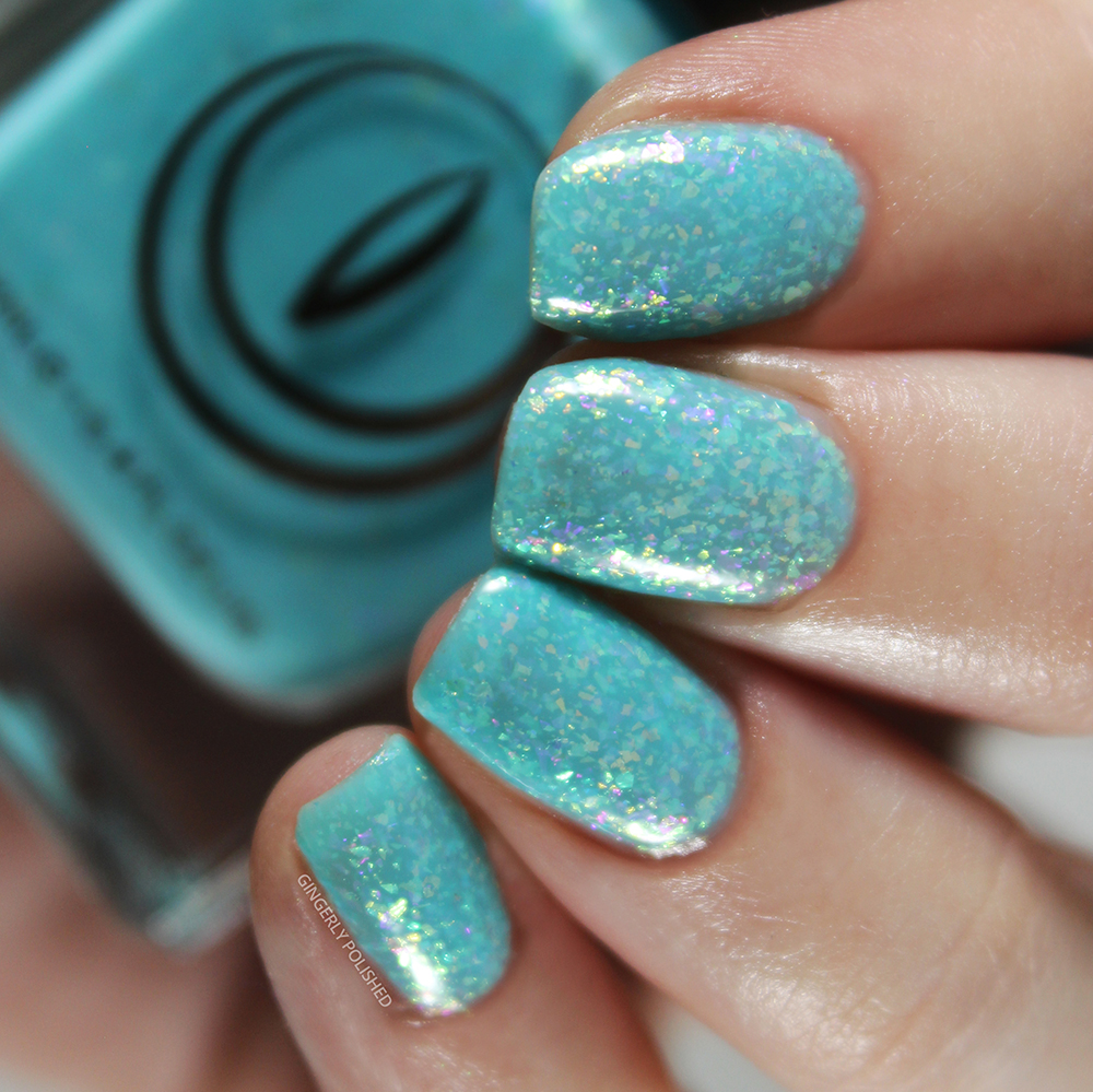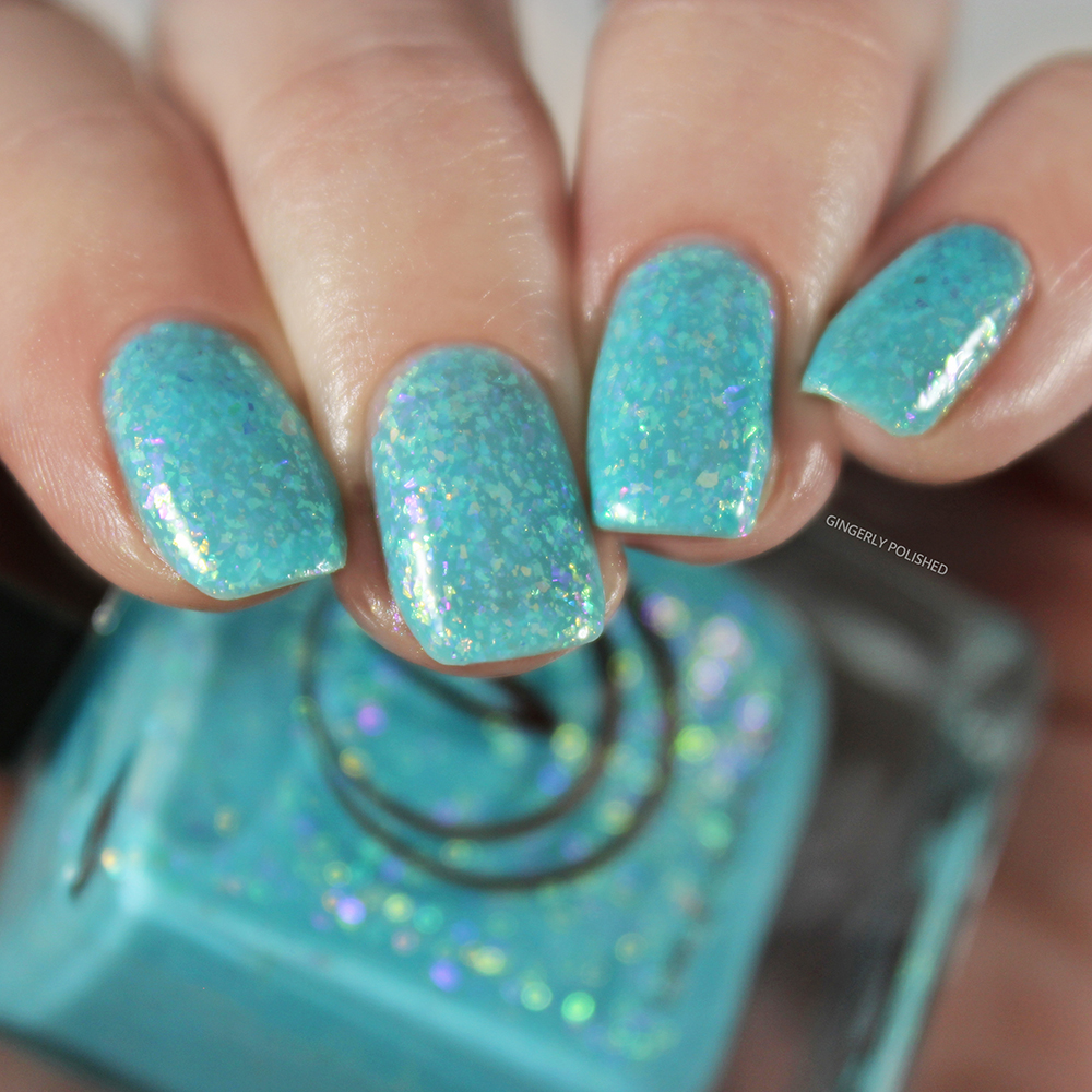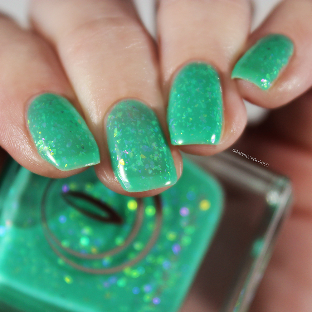 Next up we have ‘Lava Lamp’. This is my favorite type of color, with a base of gorgeous turquoise green. And of course, with those iridescent flakes floating all throughout.