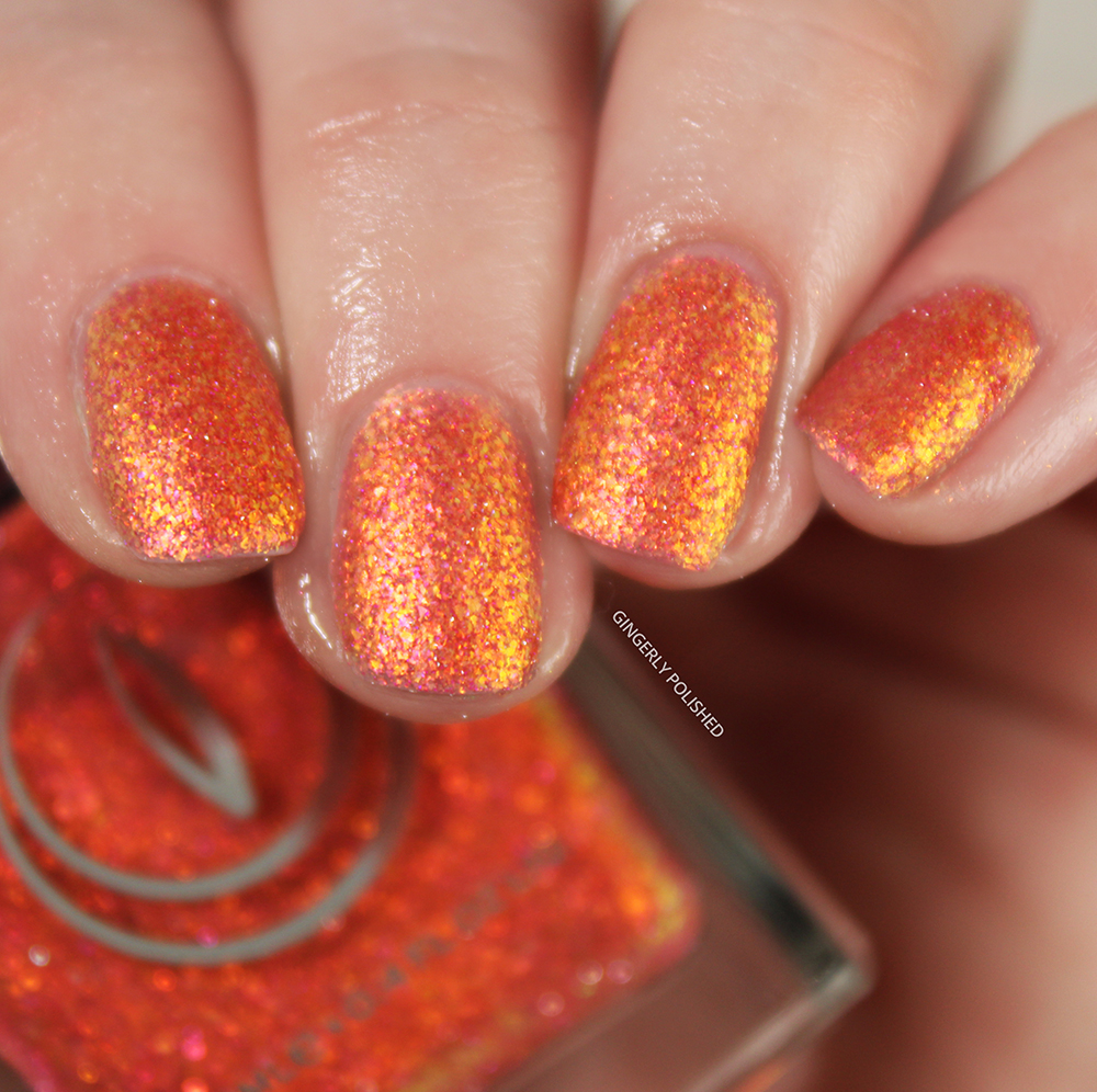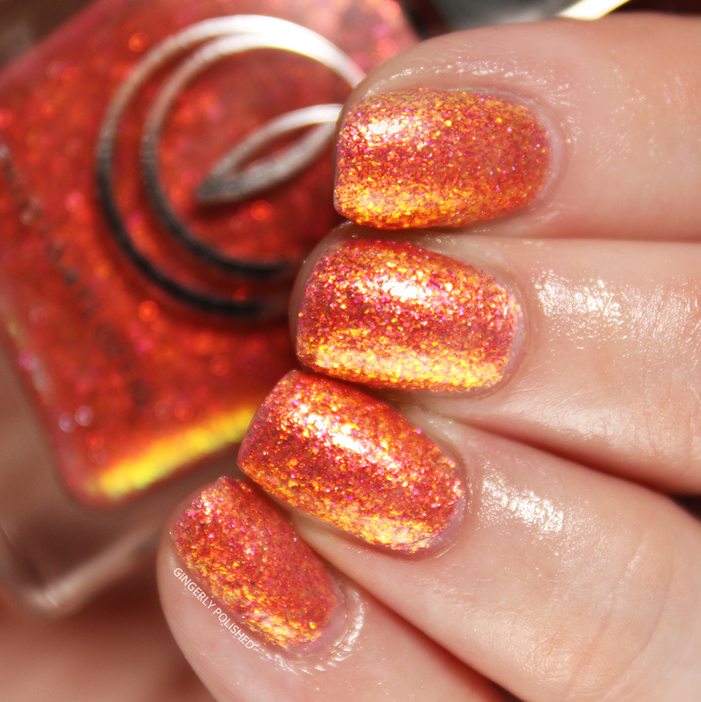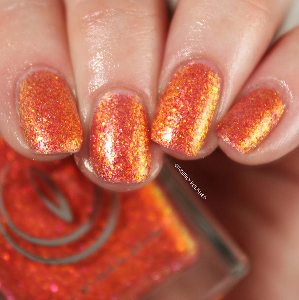 And last but CERTAINLY not least, we have ‘Molten Lava’. This is a bright coral orange base filled with delicate and shifty yellow-red flakes all throughout. Truly fiery on the nails.
