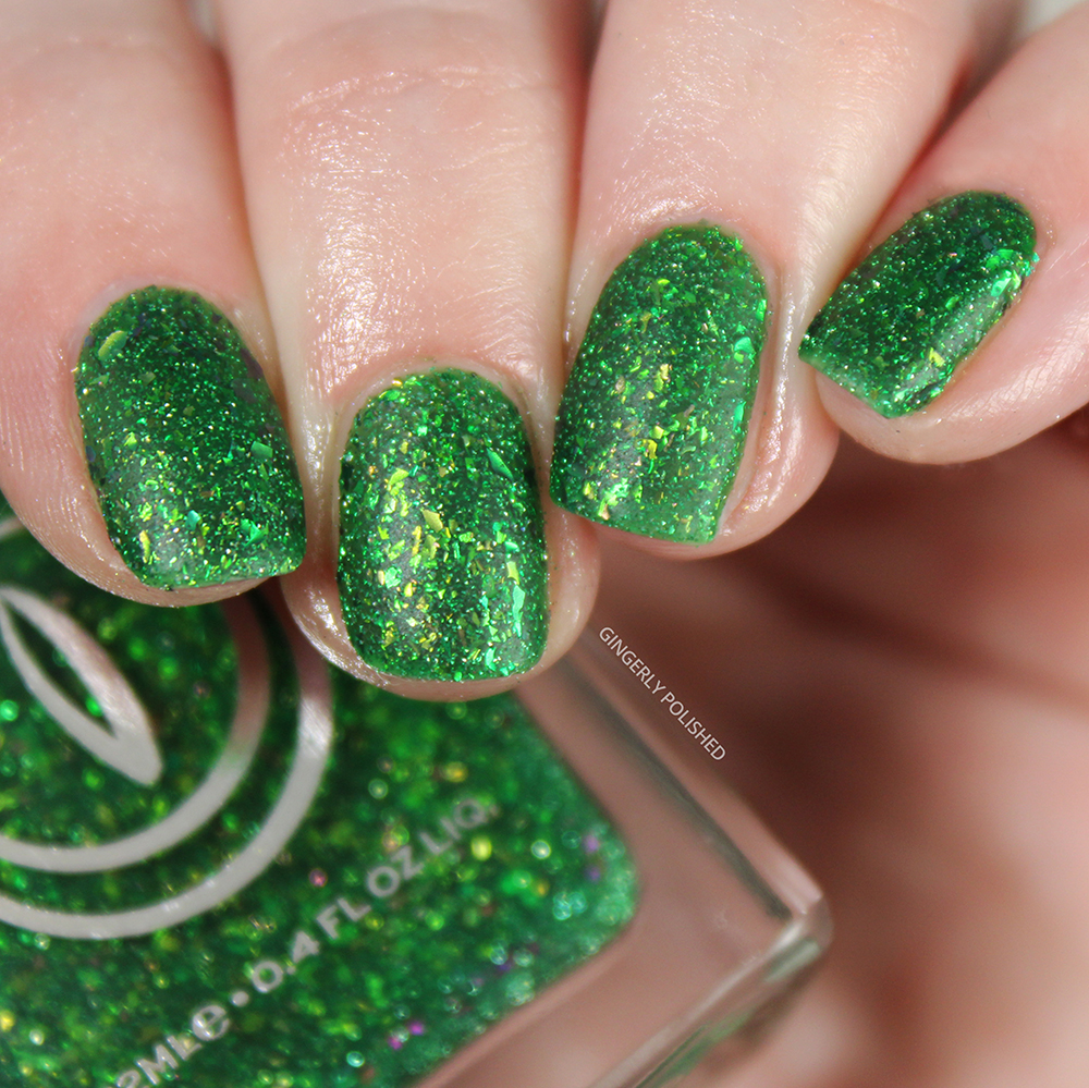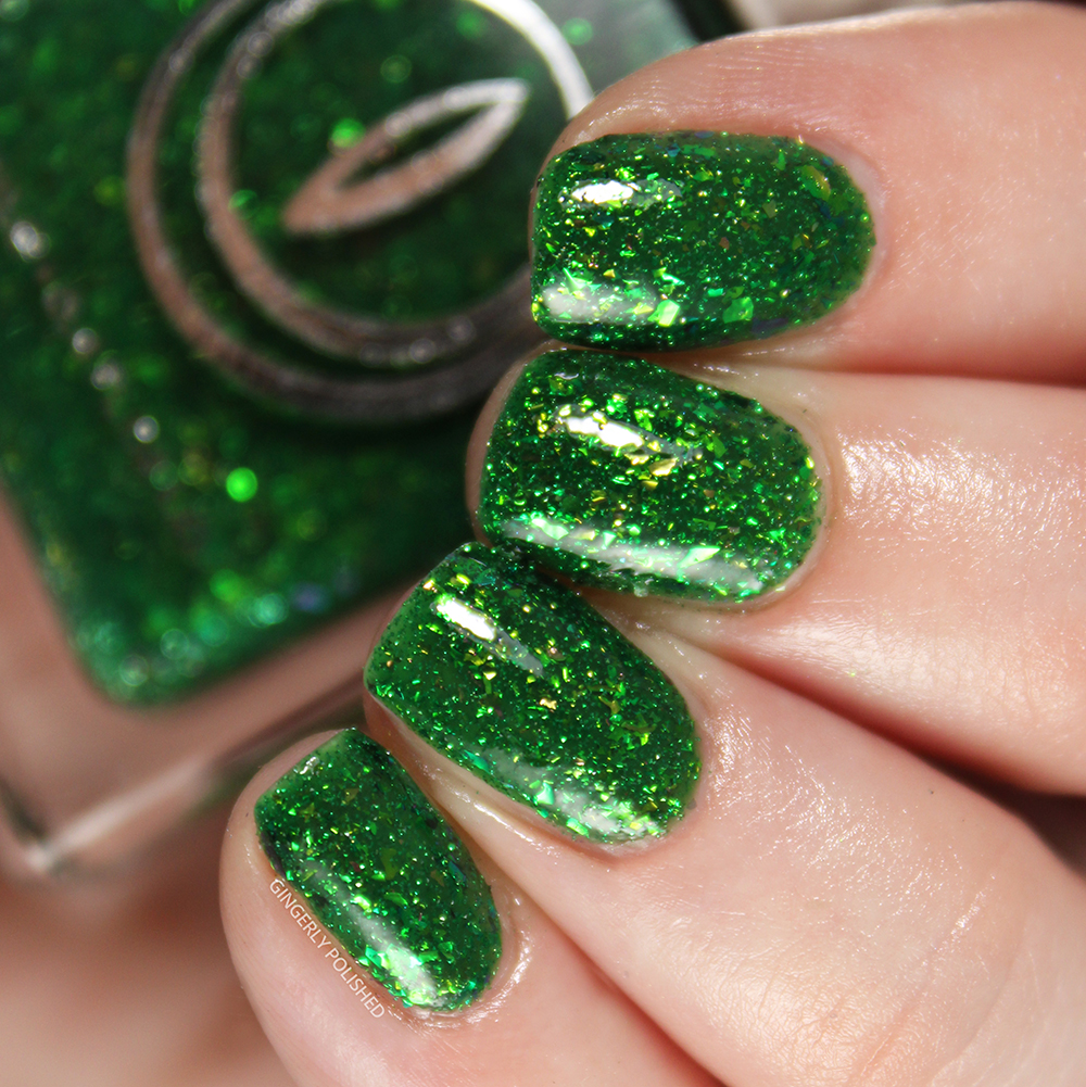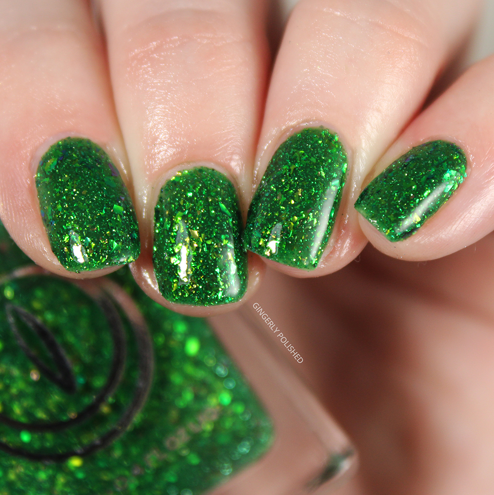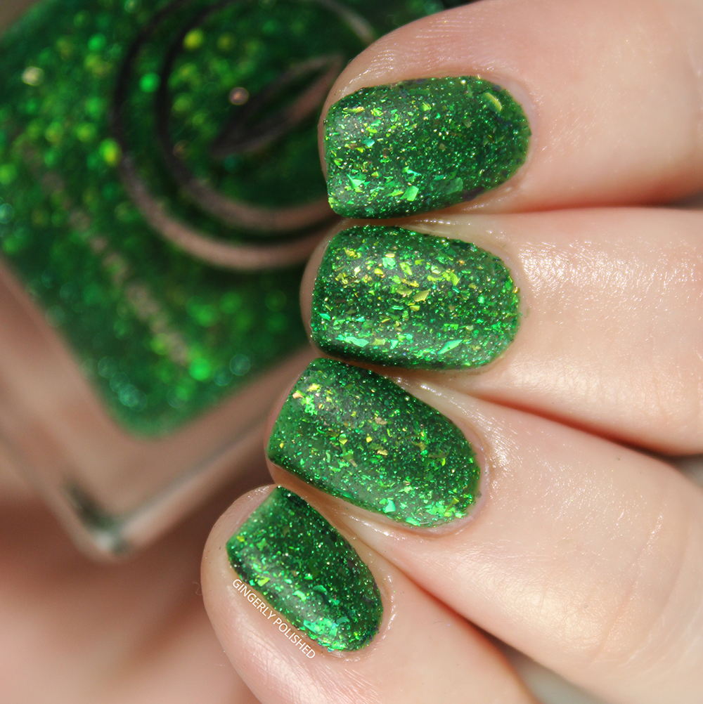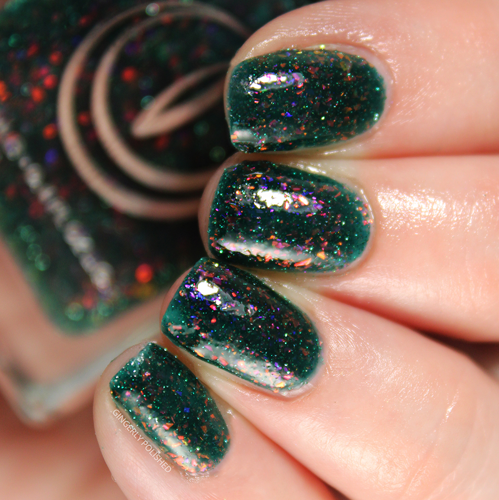 This next shades takes that previous flakey finish, and just cranks it up a few notches with a little something more. This is ‘Tyrannosaurus Hex’ and it’s a deep forest green jelly base filled with those same iridescent shifty flakes, but also a boatload of reflective glitters. (Funny enough, I forgot this one was reflective, though you really only see that bright reflective look through an iPhone camera. Otherwise, it’s still gorgeous glitter on its own).