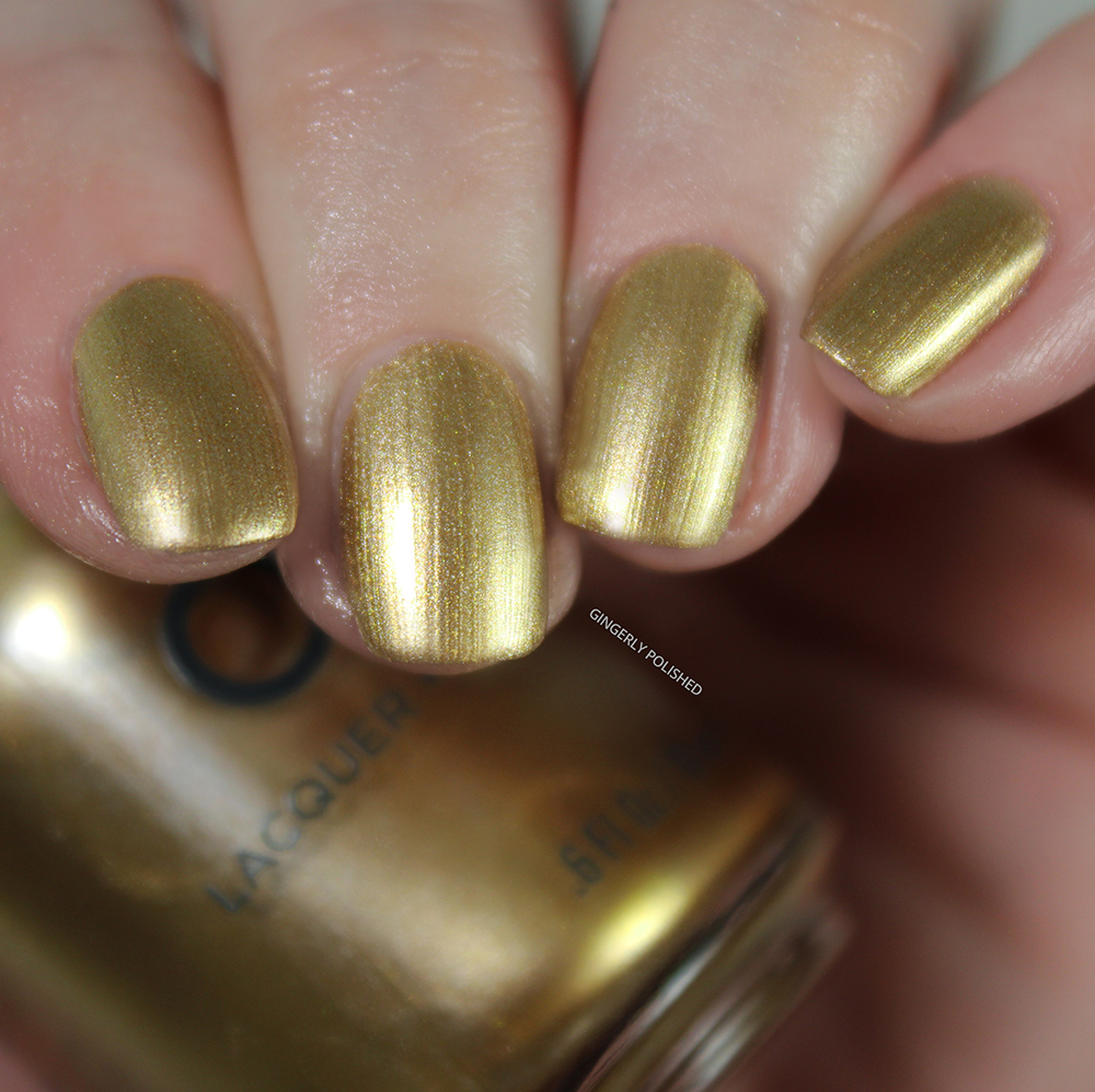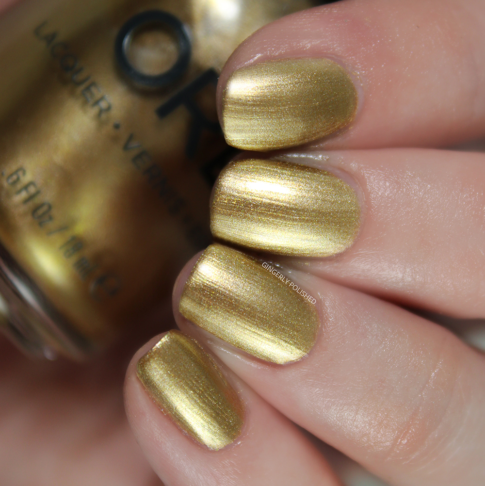 This is a warm gold metallic shimmer. It’s not too yellow, and not quite platinum, just right in the middle of golden tones. It’s definitely looking much more coppery on the Orly website than it swatched out for me. (And if you’re curious about this compared to the gold from the NASA release: this one is much less yellow toned in gold).
