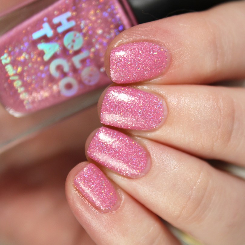 We start out with ‘Blush Money’. This one is a cooler toned, well, blush pink jelly base filled with larger silver holographic glitters. We haven’t really seen such a soft pink holographic shade from Holo Taco so we’re clearly filling in some customer desired gaps with this one.