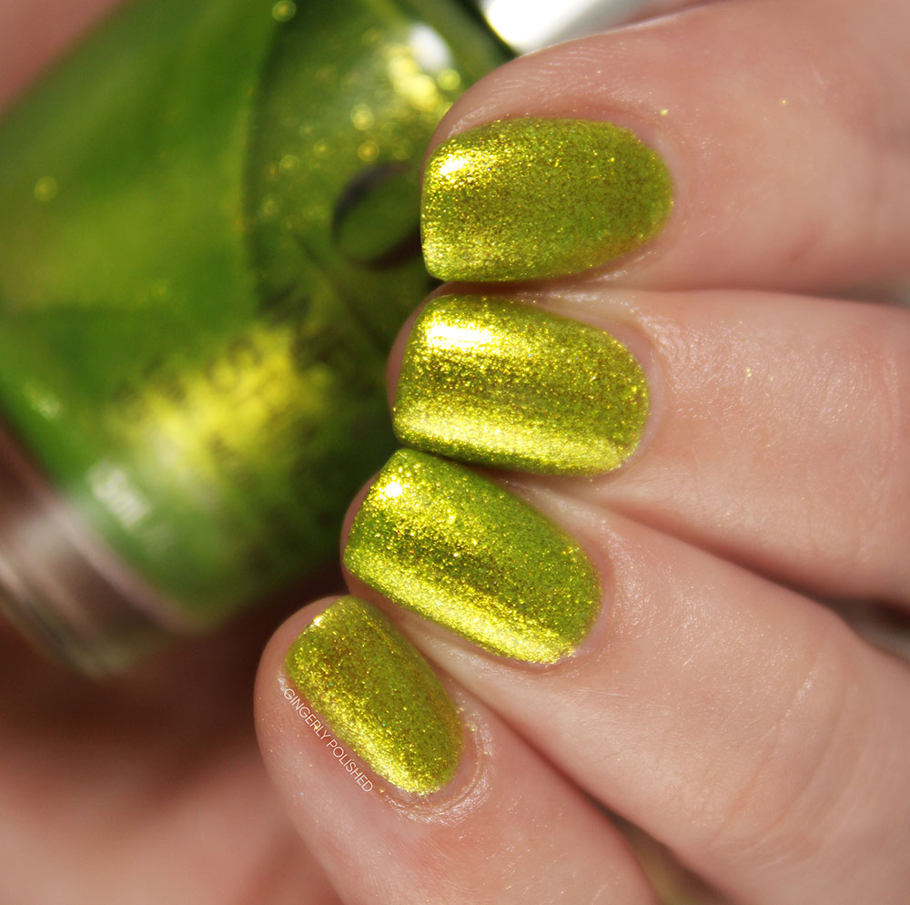 ‘Limelight’ is another shade where I’m sure you’ll be able to guess the color from the name. Yes! It’s a bright yellowy toned lime green shimmer with that same golden shimmer. Once again, that golden shimmer gets a little lost without more of a color contrast, but we still get that sparkle.