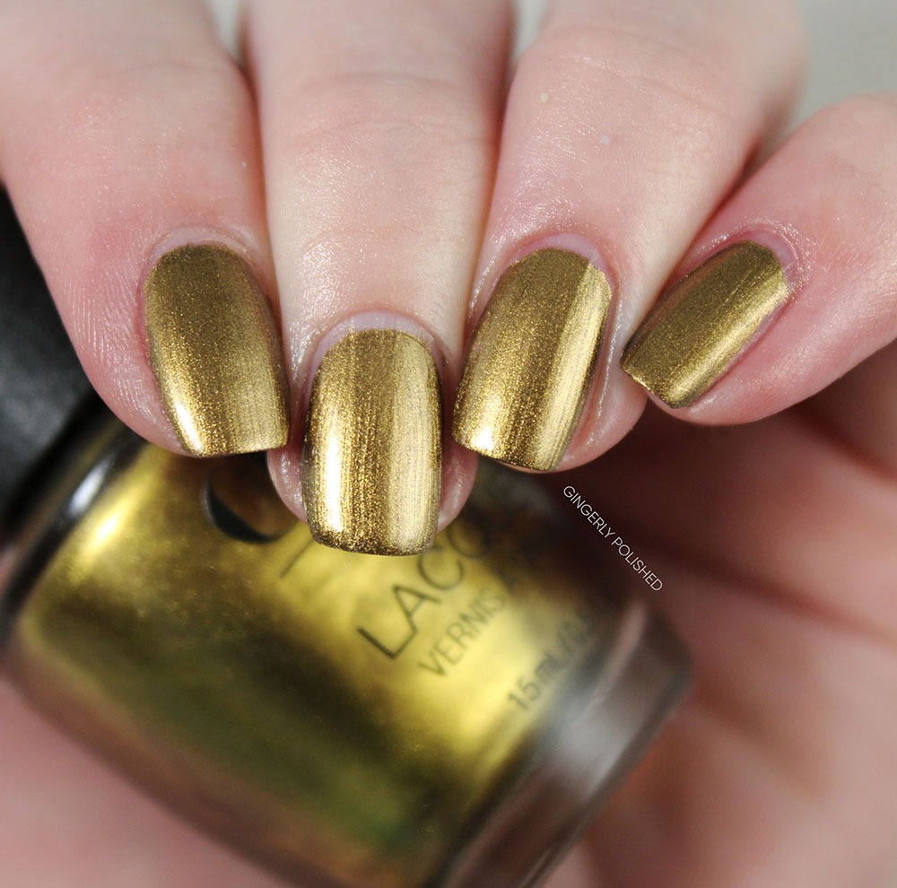 See I’m not mad about the gold above, because we have 2 gold shades next. This first shade might just be the most metallic shade of the bunch. It shines on the nails, and it gets as close to chrome as you can with regular polish. This is ‘SaTURN Me On’, and it’s a perfect “old gold”. There’s almost some olive, maybe some bronzey-ness to it, and it’s so interesting.