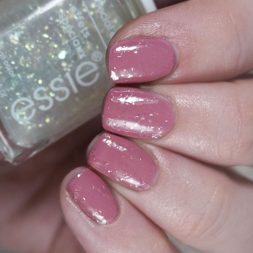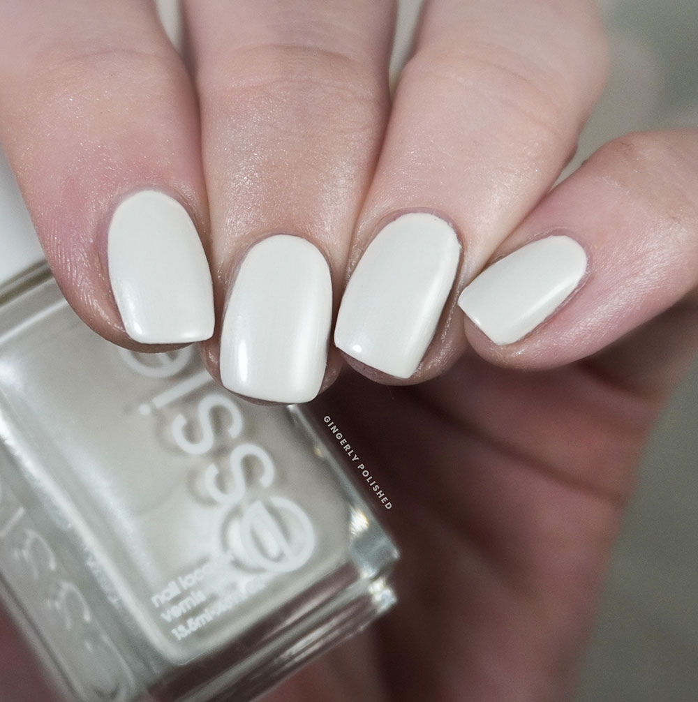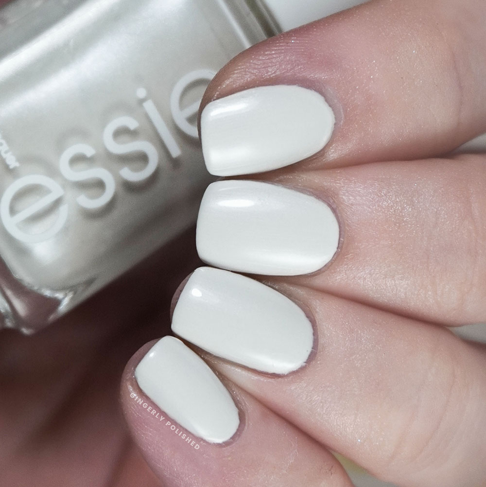We start with ‘Stay Fluid’, and I’m really trying my best to do just that with everything, Essie. This one is an off white base filled with the most delicate of silver shimmer. That shimmer just gives it a little glow, a little pearly finish, without any sort of brushstrokes. It also has the tiniest drop of gray pigment to it just softens it up from a stark white.