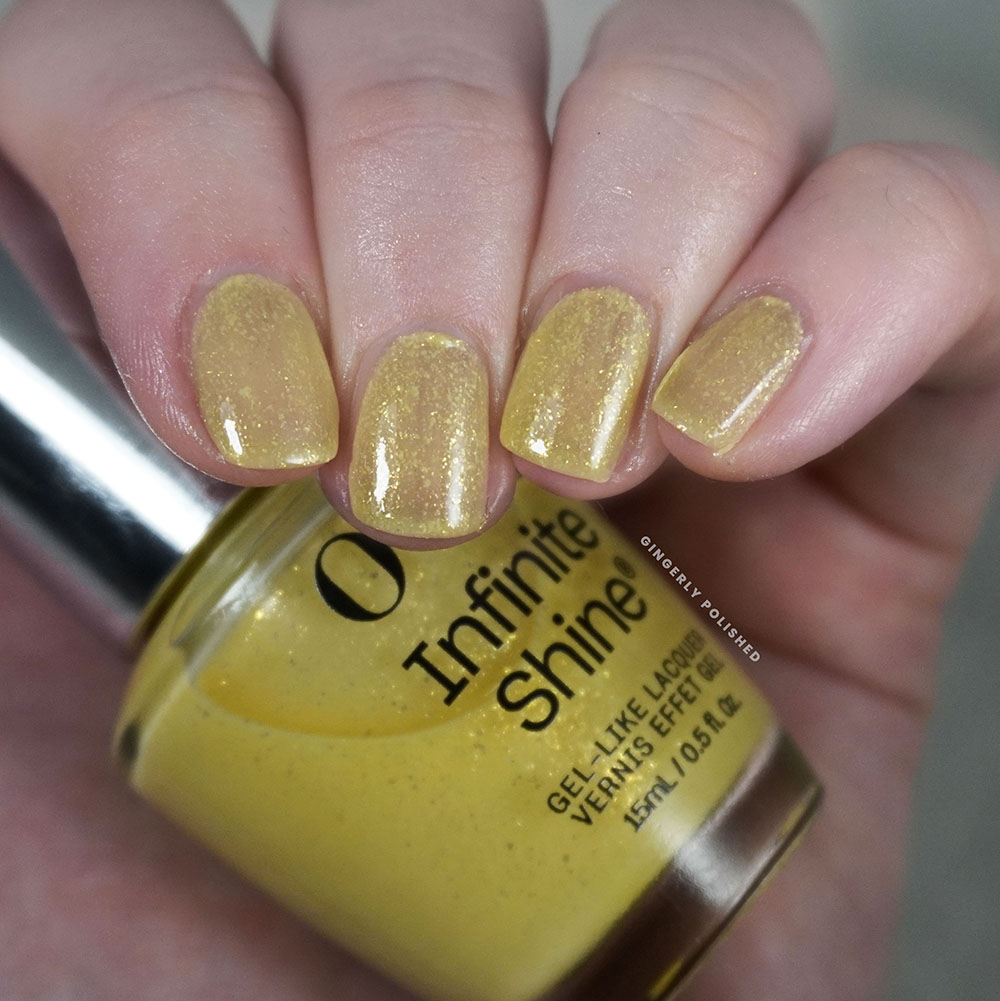 ‘Say Hello to Yellow’ is, can you believe it, a yellow. This one is a softer, buttercup yellow base filled with those same flakey golden shimmers. It takes us back to a more sheer formula so the color on the nails is going to be more muted than it’s showing in the bottle.