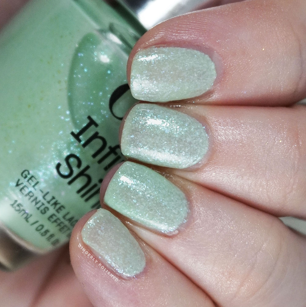 The green counterpart from the lacquer is entirely different, but of course, I’m still showing you the two green moods you could choose from. Wild that this one is called ‘AppointMINT Confirmed’ when our Infinite Shine shade the much cooler and more minty of the two, but I wasn’t invited to the naming conferences. ‘AppointMINT’ also has a finer golden shimmer to it with ‘Teals Familiar’ giving us flakey blue.