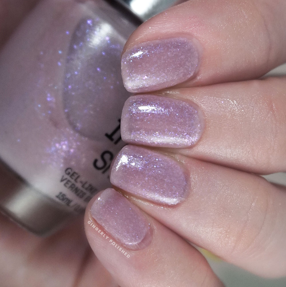 ‘When Time Stuns Still’ – what a NAME – is our purple of the set and it’s such an interesting little shade. When you’re first applying this shade, or if you leave it at 1 coat, it feels warmer and more pink toned. But as you continue to apply and build up the color, it shifts on over to a cooler, dustier purple filled with an iridescent pink flakey shimmer.
