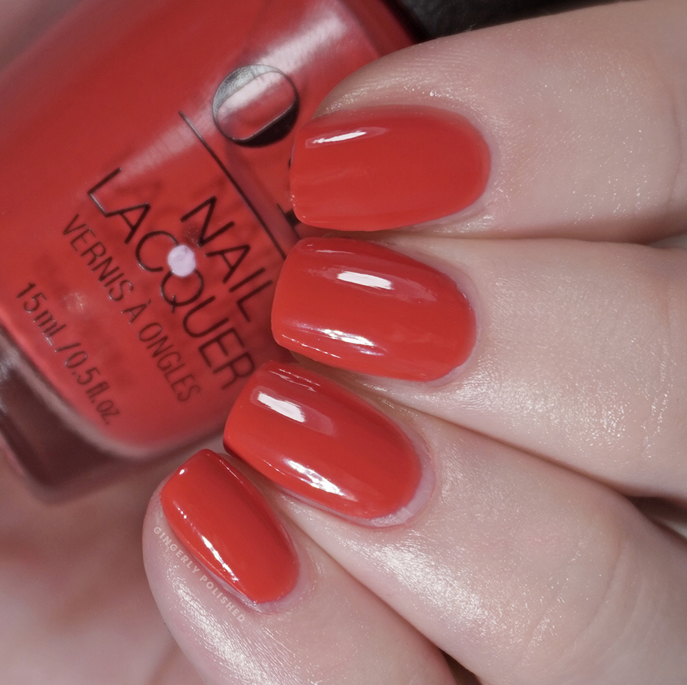 Okay, now you say you’re looking for that same shiny formula, but less pink and more red. This next shade has you covered. ‘Blushin’ Pride’ is truly the tomato red cousin of ‘Drive ‘Em Magenta’ above, and it’s so warm and orangey and fiery on the nails. Again, absolutely screaming summer and biting into fresh tomatoes from the farmers’ market (that might just be me, where are my fellow tomato fiends).